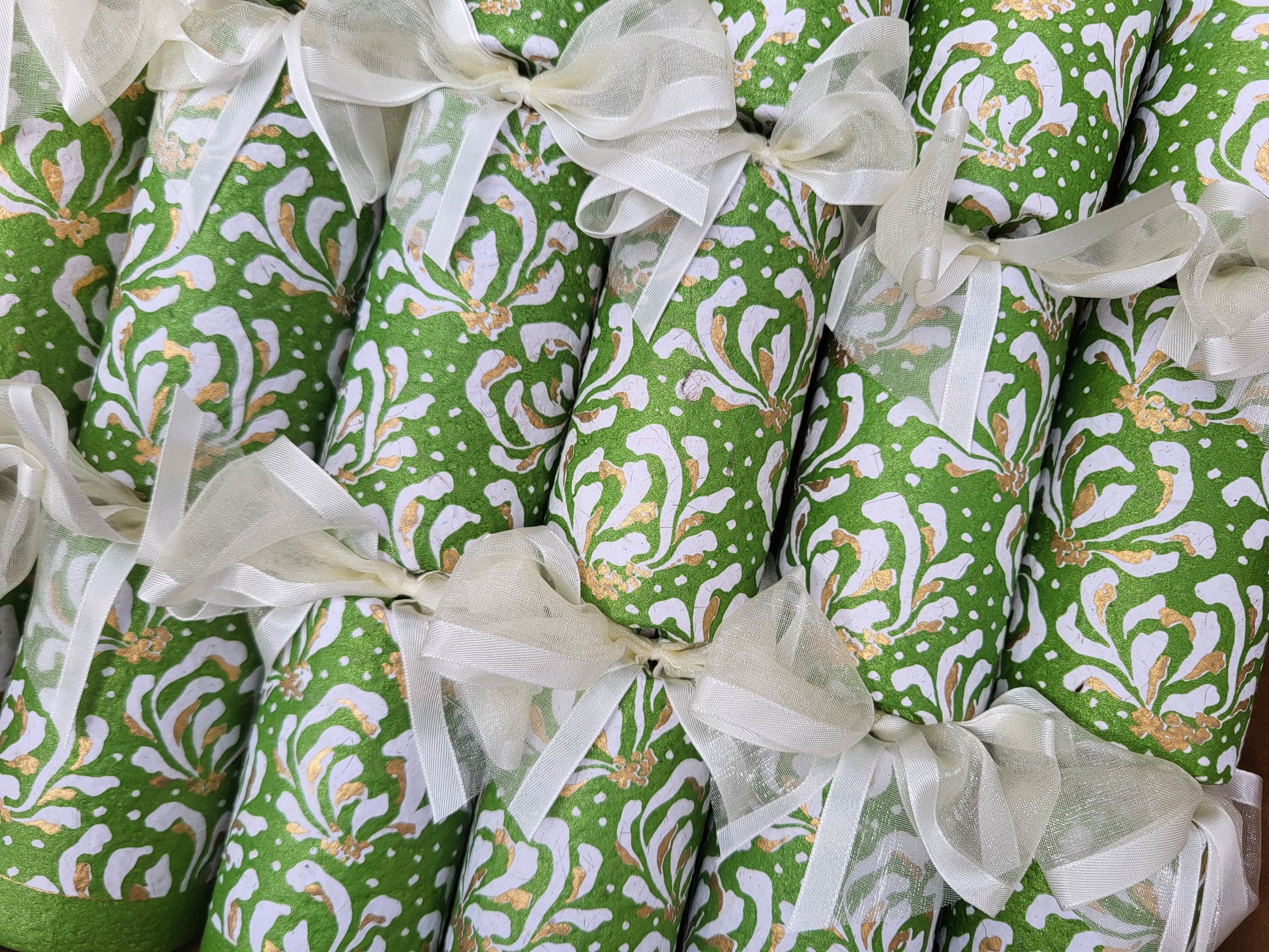 Lovingly made from handprinted and handmade hyacinth paper, each cracker is adorned with elegant ribbons and filled with a charming blend of artisanal treasures and clever little keepsakes.