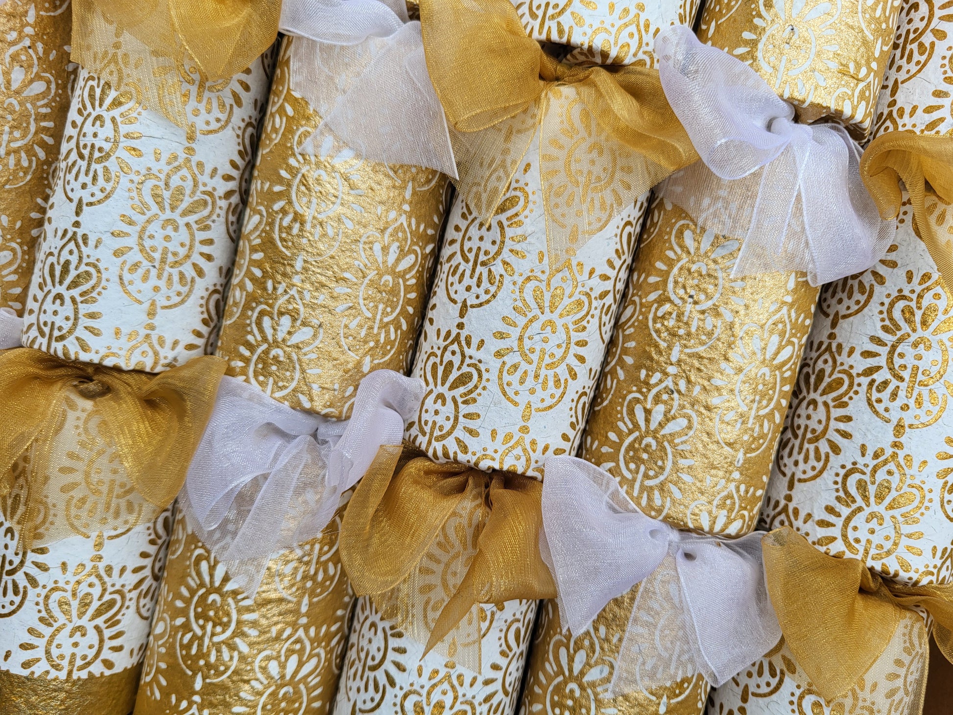Lovingly made from handprinted and handmade hyacinth paper, each cracker is adorned with elegant ribbons and filled with a charming blend of artisanal treasures and clever little keepsakes.